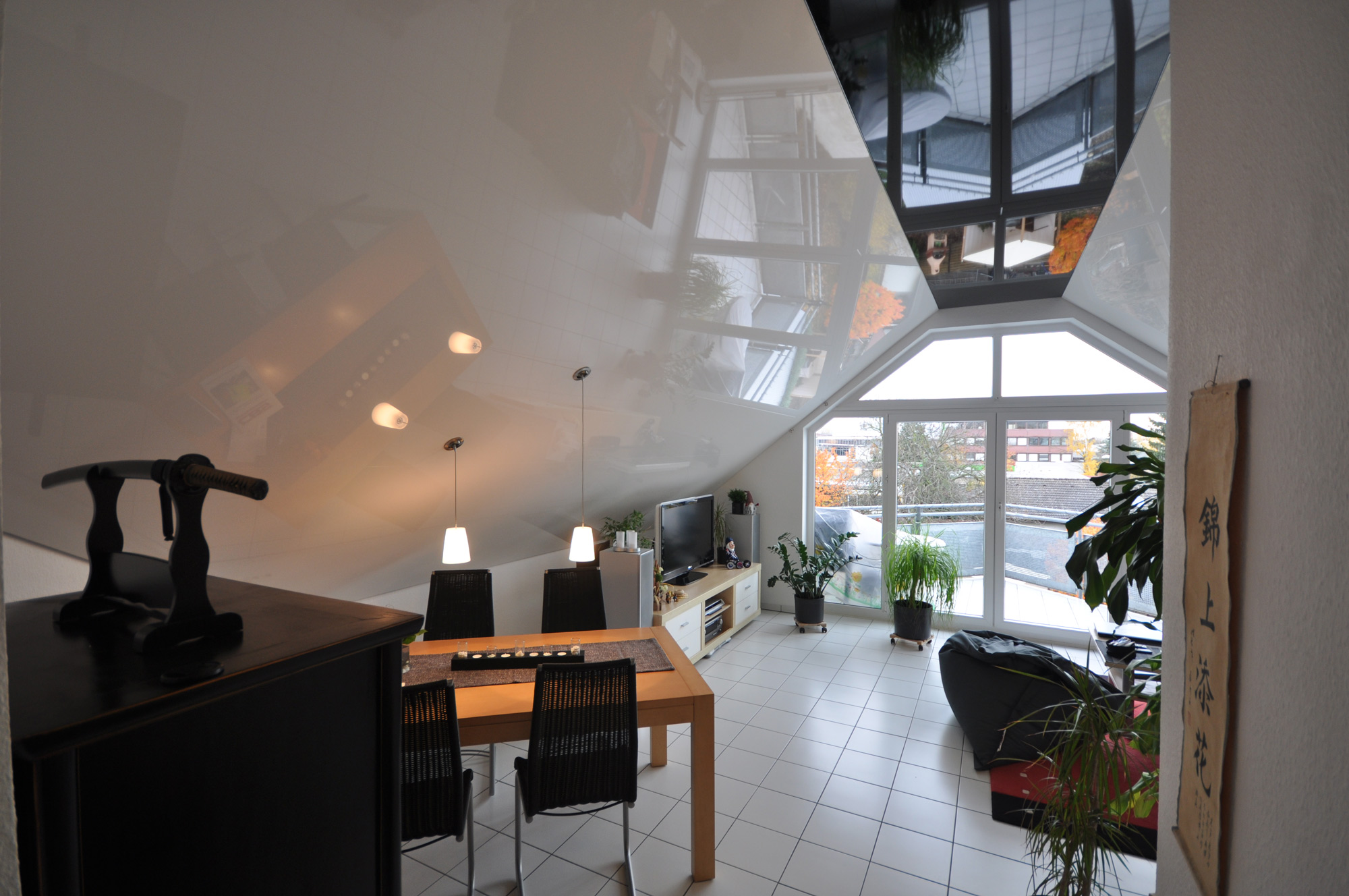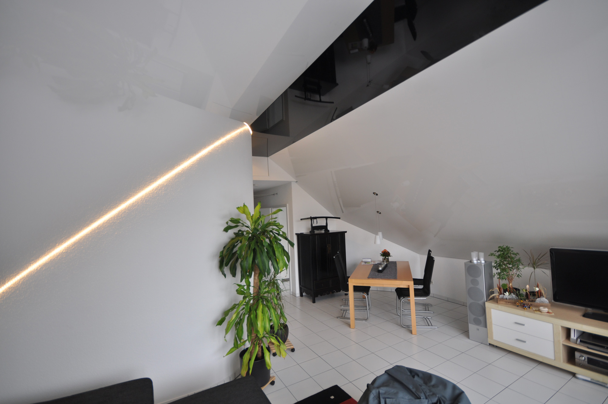 Lackspanndecke und Spanndecke in der Dachschraege