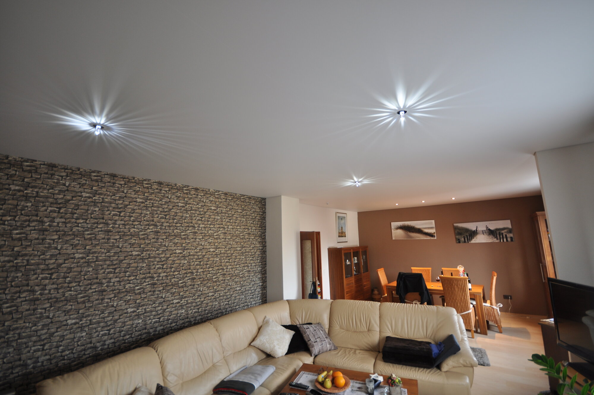matt weiße Spanndecke im Wohnzimmer mit Einbaustrahlern # ...