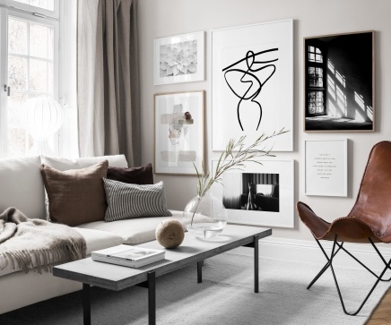 Beige fotowand in aardse kleuren met zwart-witte posters ...